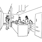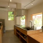 -(屋内)キッチン,コンベクションオーブン、テーブル、椅子、食器,洗剤,調理器具(鍋,フライパン、ボウルなど)、炊飯器、電子レンジ、トースター、使い捨てふきんなど